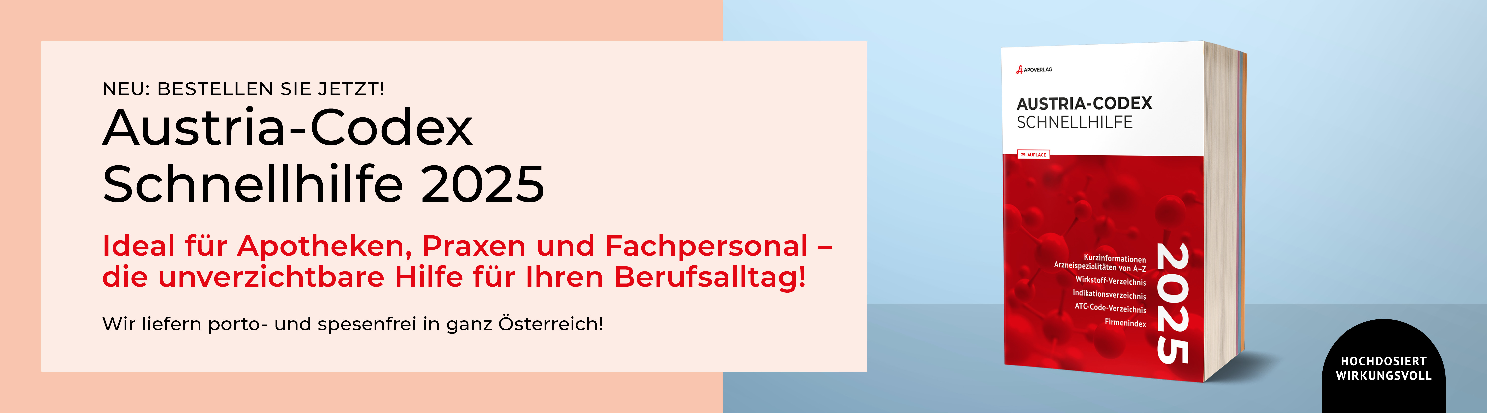 Wenn es um Pharmainformationen oder Apothekenbedarf wie Werbemittel geht, sind Sie im APOSHOP genau richtig: Im Onlineshop des Österreichischen Apotheker-Verlages finden Sie Alles für den Apothekenbedarf wie Arbeitsmittel, Lehr- & Fachbücher, Verpackungen und immer aktuelle Pharmainformationen wie z.B. den Austria-Codex oder das Warenverzeichnis für einen reibungslosen Ablauf in Ihrer Apotheke. Wir bieten unser Sortiment auch für weitere Branchen und Fachgruppen an wie PKA, Ärztinnen und Ärzte, Krankenanstalten, Pflegeheime, Hausapotheken, Tierarztpraxen und Pharmaunternehmen. Sie haben noch kein Konto im APOSHOP? Jetzt registrieren und Ihren Warenkorb mit den richtigen Produkten für Ihre Apotheke befüllen!